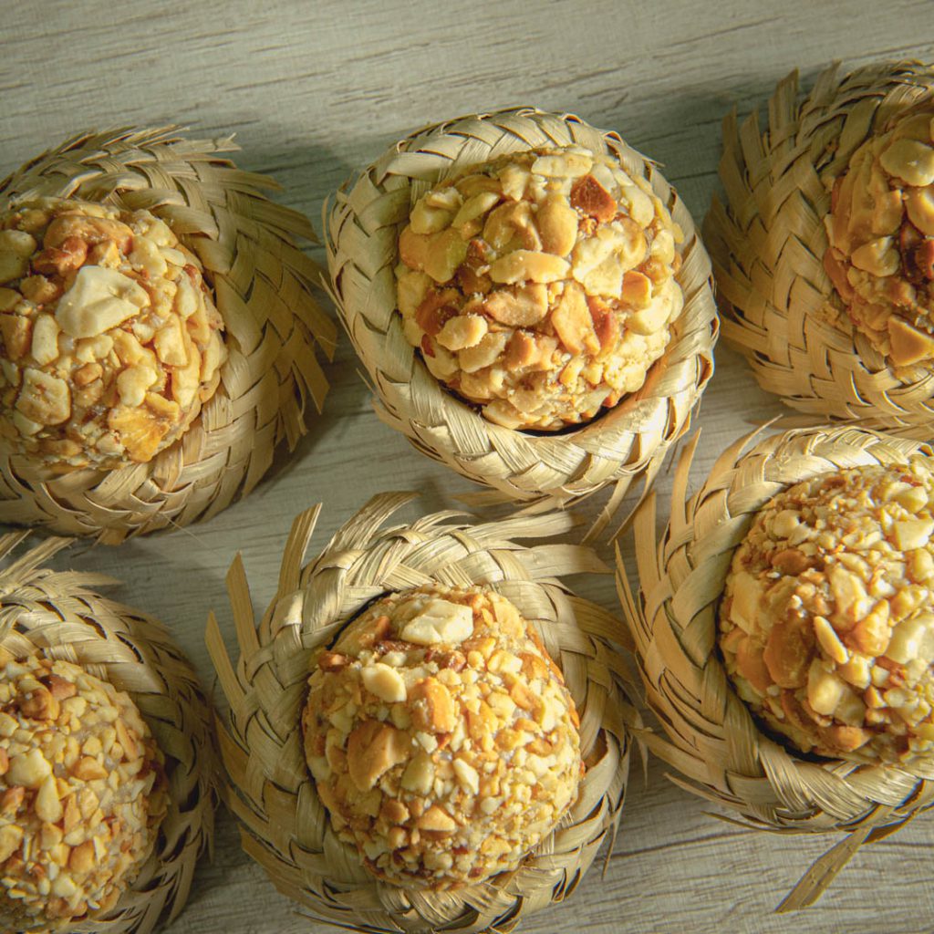 ☑ Espere esfriar, unte as mãos com margarina e enrole as bolinhas passando na farinha grossa de amendoim triturado reservado. ⠀